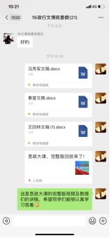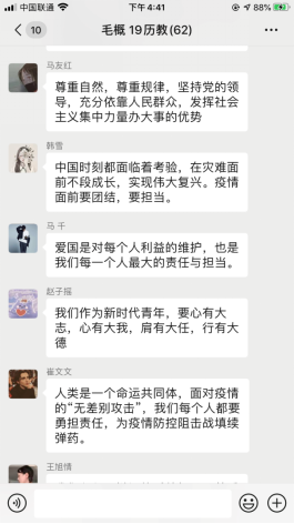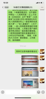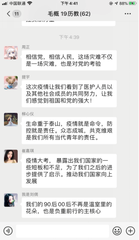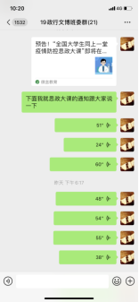 在各辅导员老师的带领下,同学们借助QQ、微信等线上平台就四位教授所讲授的四个话题——人与自然的关系、疫情大考的感悟、历史回顾及经验总结和中国青年的责任与担当,展开课堂学习交流讨论活动。通过“云端”,同学们畅所欲言,踊跃为自己的思想发声,在欢乐中加深了对思政课的理解,纷纷表示面对疫情,身为青年学生不能退缩,而是要坚决面对,学习最美逆行者的榜样精神;坚定理想信念,积极承担作为当代大学生的历史使命和责任担当;努力学习,具备“风物长宜放眼量”的人生态度,共同打赢这场防疫战。除了组织同学们开展在线课后讨论外,我院积极组织同学们撰写学习心得体会,通过字里行间表达和分享自己的感知体会,真正肩负起自己的使命,勇于承担自己的责任,志存高远。在以习近平同志为核心的党中央的坚强领导下,坚定打赢这场疫情防控人民战、总体战、阻击战的信心和决心,为共同抗击疫情贡献自己的一份力量,与全国大学生一起共同谱写一首防疫进行曲。