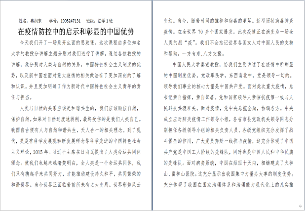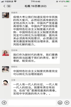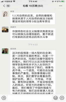 有效的学习必须要有相应的思考与交流,才能更好地提高师生的思想认识与政治站位,更好地升华个人道德与人文素养。我院按照学校统一工作要求部署,要求辅导员与马克思主义学院思政教师协商配合,引导全体学生针对“全国大学生同上一堂疫情防控思政大课”的课堂教学内容展开讨论反思,碰撞出思想的火花。