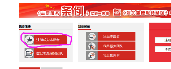 方法1:电脑登录:http://www.hbzyfw.cn/,进入河北志愿服务网,按要求填写资料。如下图所示